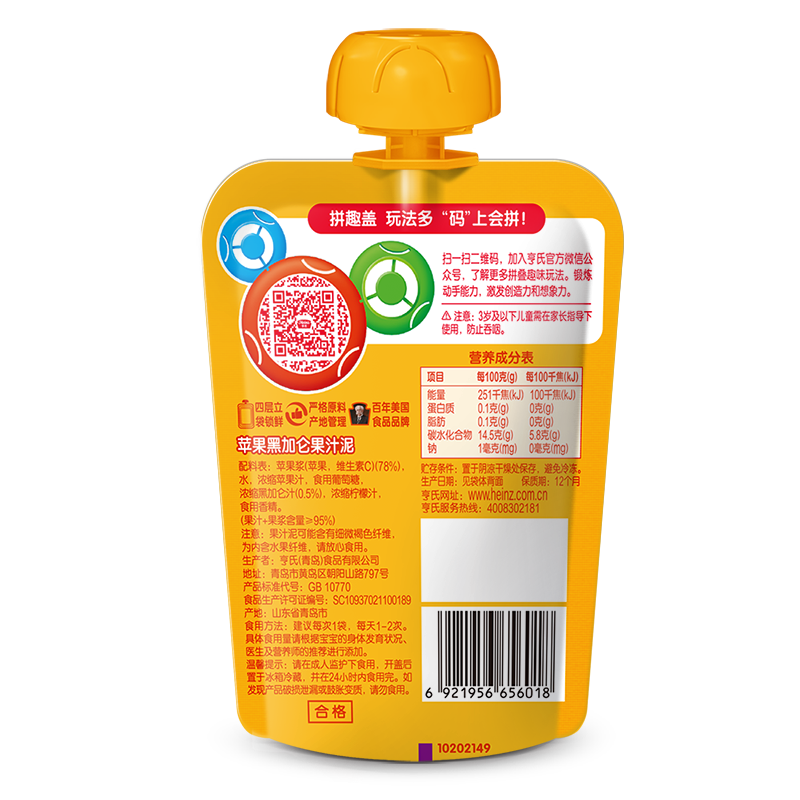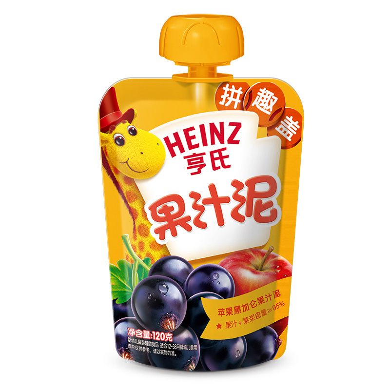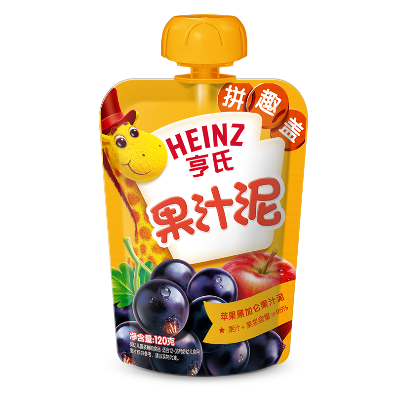 亨氏(Heinz)果汁泥 嬰兒水果泥寶寶輔食泥零食(1-3歲適用) 黑加侖蘋果120g