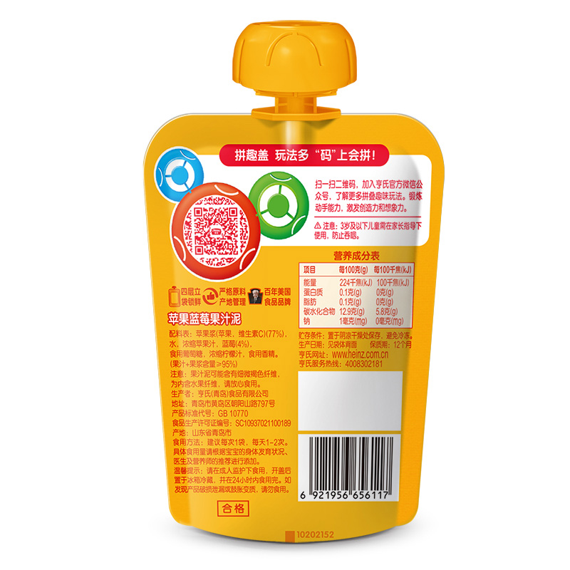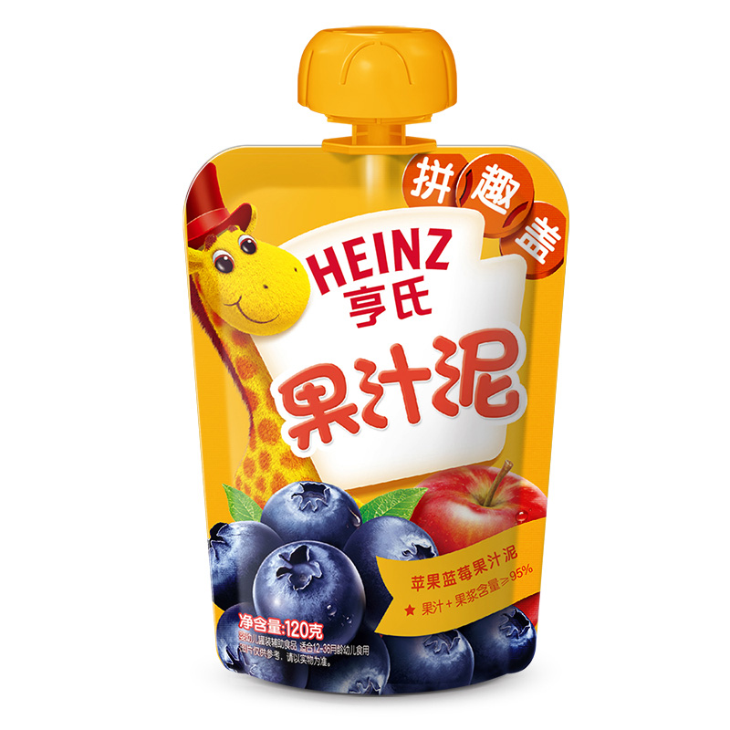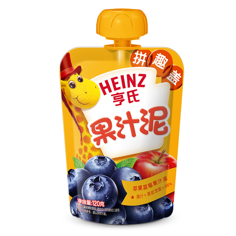 亨氏(Heinz)果汁泥 嬰兒水果泥寶寶輔食泥零食(1-3歲適用) 藍(lán)莓蘋果120g